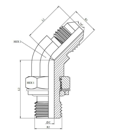 45° kniekoppeling instelbaar 1/2" BSP - JIC 3/4" 16h UNF buitendraad