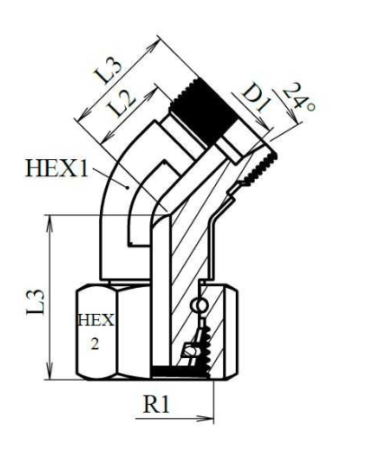 Deze instelbare kniekoppeling van 45 graden zorgt voor een efficiรซnte verbinding in hydraulische systemen. Met een binnenconus van 24 graden biedt het een betrouwbare oplossing voor complexe installaties.