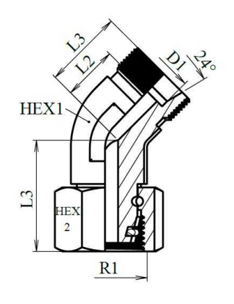 De instelbare kniekoppeling van 45° biedt een betrouwbare oplossing voor het verbinden van hydraulische slangen en leidingen. Dankzij de stevige staalconstructie en de 24° binnenconus garandeert deze koppeling een efficiënte en duurzame werking in diverse hydraulische systemen.