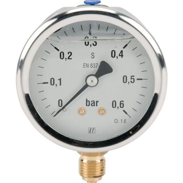 Manometer aansluiting onder 63mm rvs gevuld met glycerine 0-0,6 bar