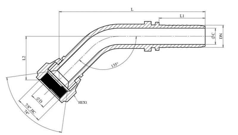 โ JIC โ Perskoppeling โ 9/16" 18h UNF โ 5/16" DN โ 45ยบ