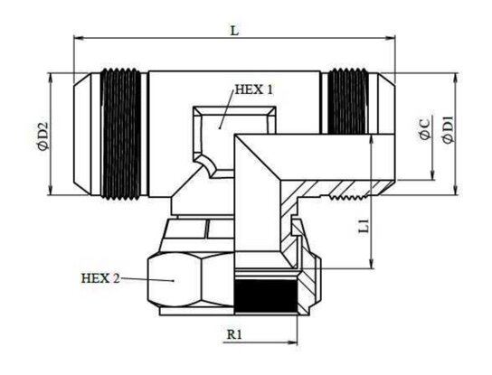 RVS instelbare T-adapter JIC 1" 1/16 12 UNF (T-uitvoering)