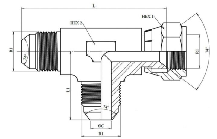 RVS instelbare T-adapter JIC 1" 5/16 12 UNF (L-uitvoering)