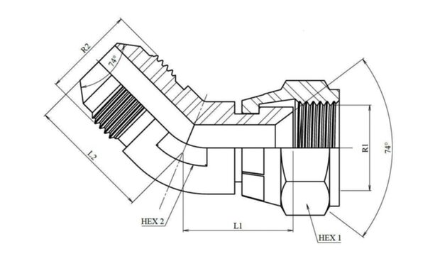 โ RVS instelbare kniekoppeling 45ยบ โ JIC โ 1" 5/16 โ 12h UNF