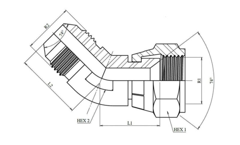 โ RVS instelbare kniekoppeling 45ยบ โ JIC โ 7/8" โ 14h UNF